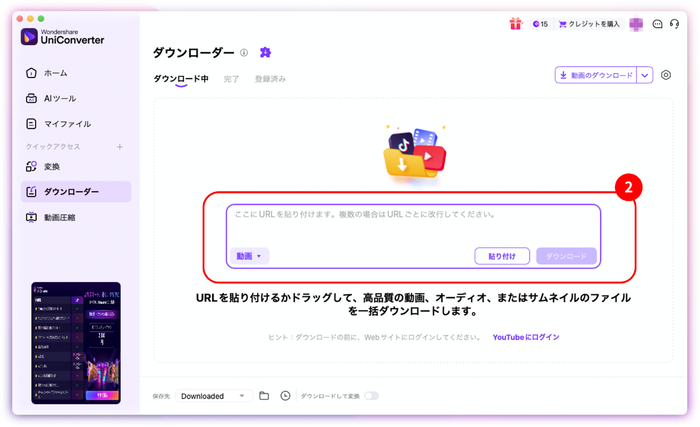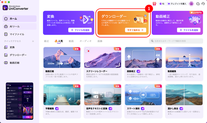 UniConverterを起動し、画面上部に表示される「ダウンローダー」タブをクリックします(①)。