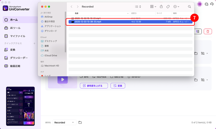すると、画面録画した動画が自動的に保存されます(⑦)。