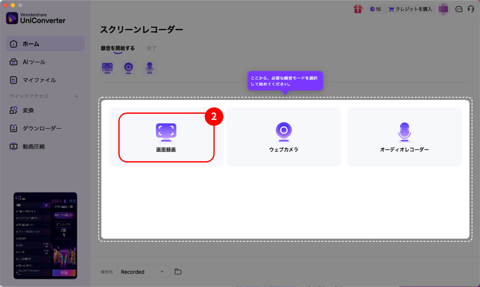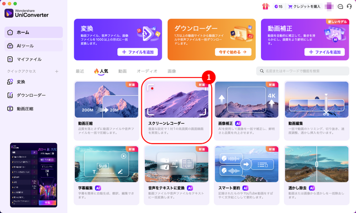 UniConverterを起動し、画面中央に表示される「スクリーンレコーダー」タブをクリックします(①)。