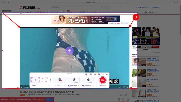 明るいエリアが画面録画される領域なので、動画の外枠に合わせましょう(③)。