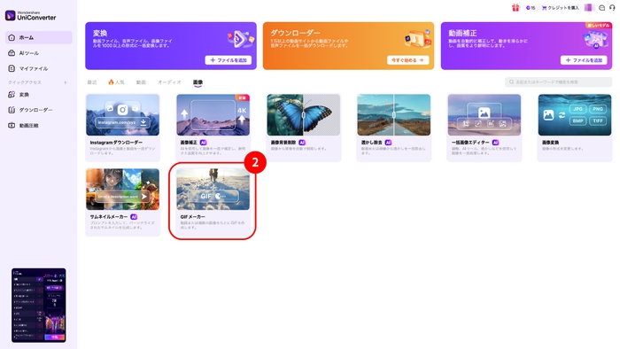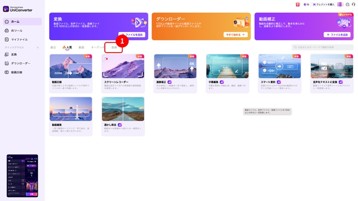 UniConverterを起動し、「画像」タブを選択します(①)。