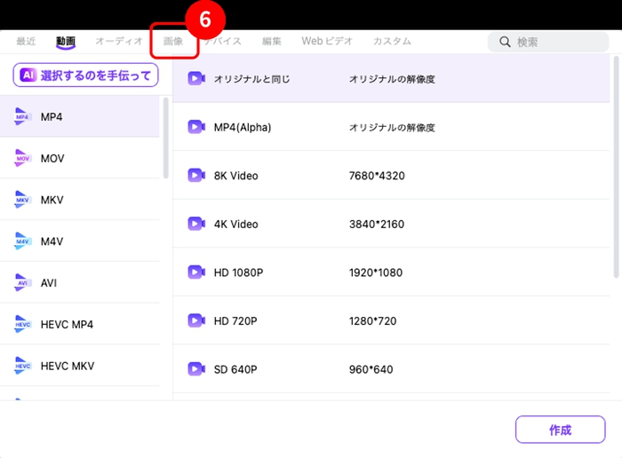 動画がUniConverterに取り込まれるので、動画のファイル形式が表示されるタブを選択します(⑤)。