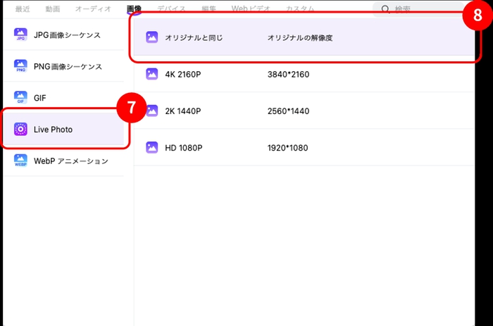 「Live Photo」を選択し(⑦)、解像度を選びます(⑧)。