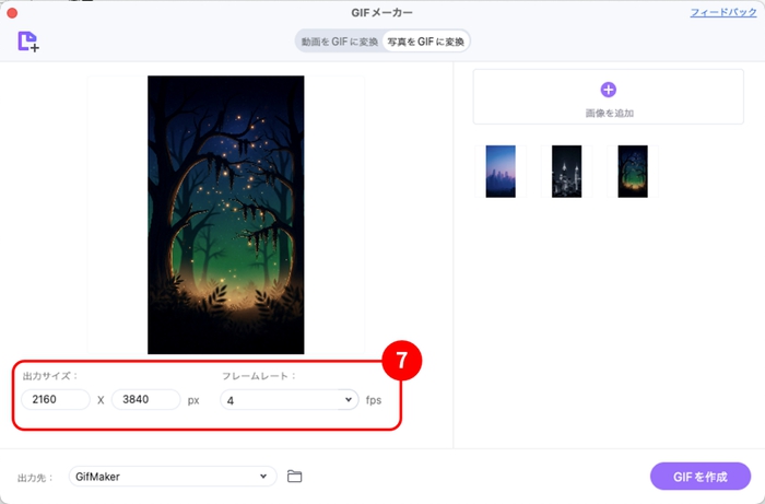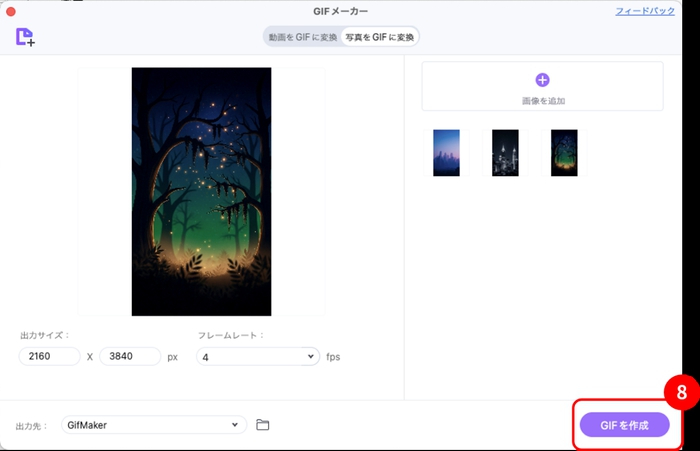 設定が終わると、「GIFを作成」ボタンをクリックしましょう(⑧)。
