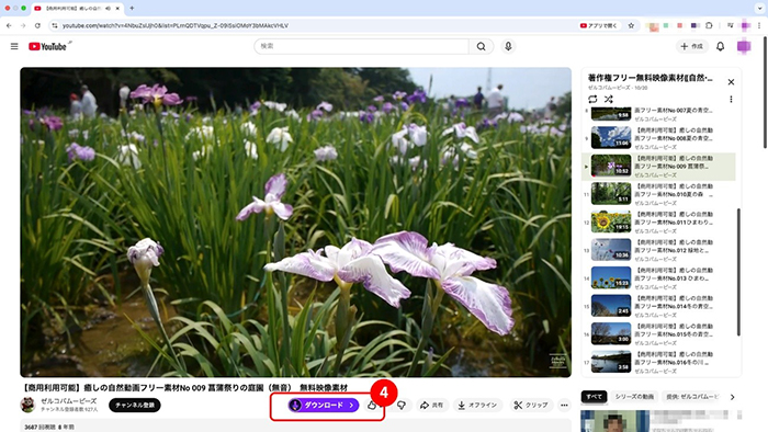 ブラウザでダウンロードしたい動画にアクセスします。すると、動画の下に「ダウンロード」ボタンが表示されるので、ボタンをクリックしましょう(④)。