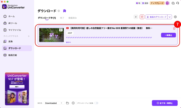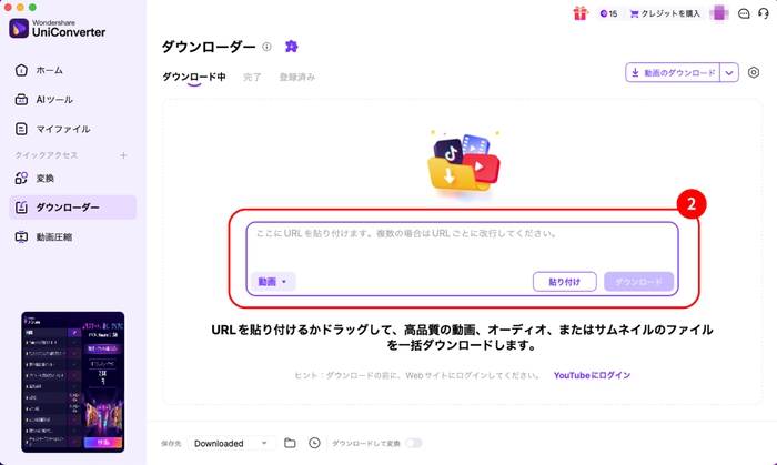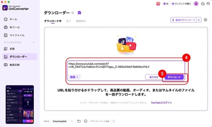 UniConverterの通常機能でYouTubeをダウンロードする手順