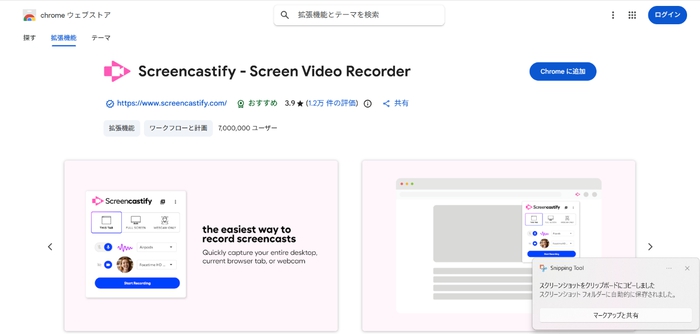 Screencastifyは、YouTubeそのものを直接ダウンロードする代わりに「画面録画」で動画を保存できる拡張機能です。録画後は簡易編集やクラウド共有も可能です。